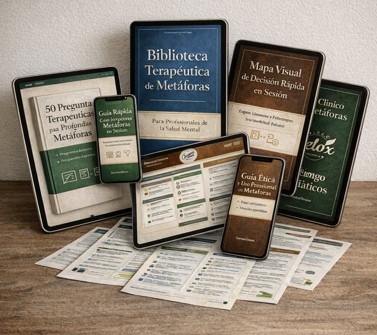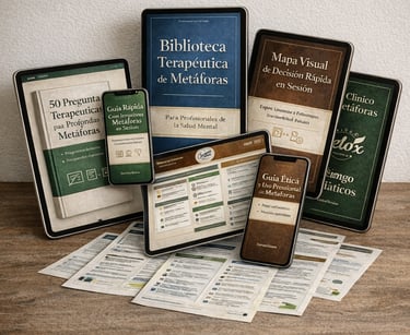 Esta colección reúne metáforas terapéuticas organizadas por áreas clínicas, pensadas para facilitar la elección del recurso adecuado según el momento del proceso y el estado del paciente.