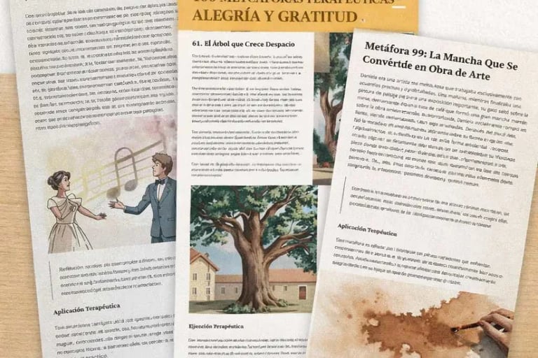 Recibirás una biblioteca clínica completa de metáforas terapéuticas ilustradas, organizada para facilitar su uso inmediato en sesión.